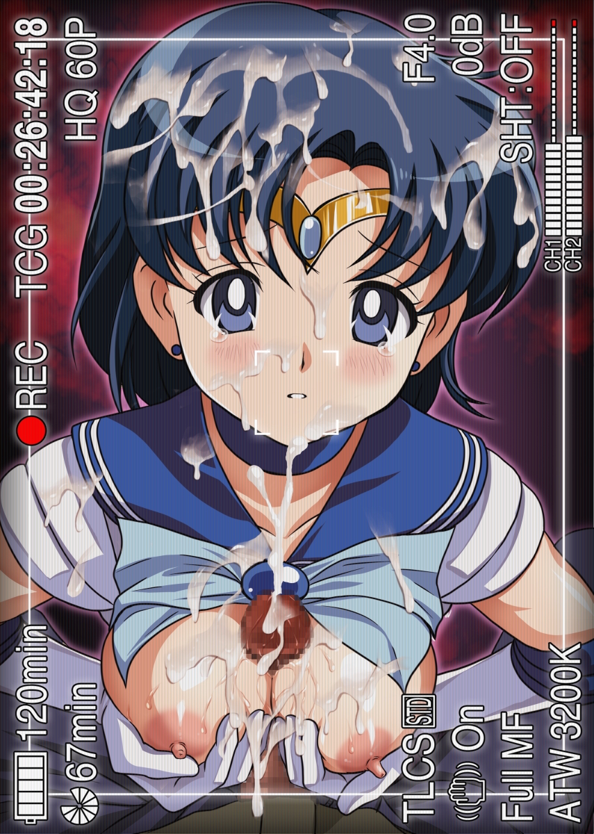 男の肉棒の先端から大量の精液が亜美の綺麗な顔めがけて